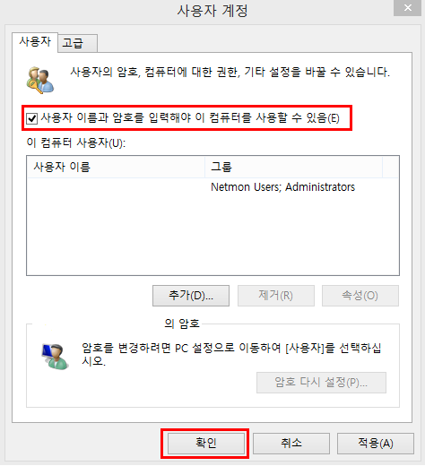 2. "사용자 이름과 암호를 입력해야 이 컴퓨터를 사용할수 있음" 체크 해제